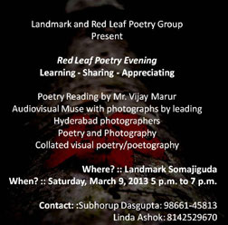 Red Leaf Poetry Evening is an event that took place on 09-Mar-2013 in Hyderabad.