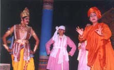 The ballet opened with the child Narendra at play with his friends. It was a prolonged episode of butter-eating (?), with monkeys, horses, peacocks et al joining in the fun. The lad grows overcoming fears of all kinds, and finally evolving into the preaching youth. Sobha initially made genuine efforts to fit into the costume as well as into the role of Vivekananda. But it took a while for the flow of the tale to be absorbed by all concerned. The students playing different roles were often influenced by the art form rather than by the story, like in the case of the artiste who played Ramakrishna Paramahamsa's wife Sarada Devi overdoing her abhinaya.