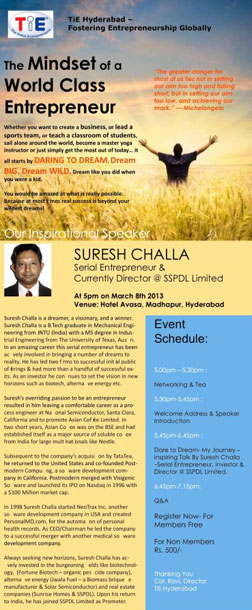 The Mindset Of A World Class Entrepreneur By TiE Hyderabad is an event that took place on 08-Mar-2013 in Hyderabad.